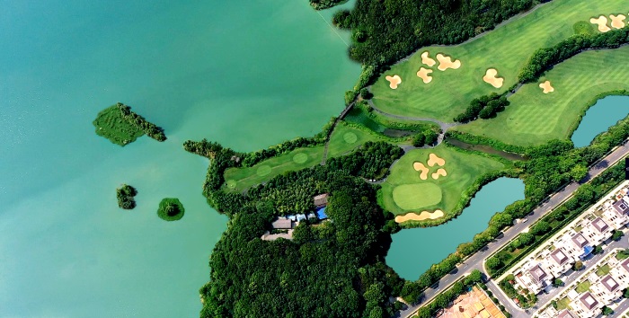 设计大师立足深远,匠心独运,博采众长,将欧洲风格、亚洲特色、本地情调巧妙地融汇在桃花源球场之中,使球场呈现极具浓郁的贵族气息、动人心魄的艺术魅力以及超一流的精品特质。国际锦标赛级标准的18洞球场充满山灵水秀韵味。星罗棋布的人工湖与叠嶂的群山相印生辉,联手将球道拥入怀抱,宛若苍海扶月,令人充分体会到回归大自然的乐趣。
